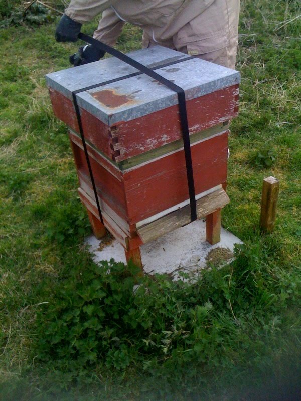 So off we all set. Lots of careful, slow driving to their new home. Perfect nice clear evening for a tricky job. Once we got to their new site its all about reversing the process. So the hives are carefully set on to their paving slab bases and orientation is thought of. We've tried to set them so that once the bees woke up this morning they would notice instantly that their hives were facing a different direction and therefore something important had changed. Foam blocks were removed but we've left the straps on for now as being a much more rural spot, there might be danger from predators like badgers who could knock a hive over.At last they looked settled in their new home. Its a lovely spot with pretty trees already starting to blossom.